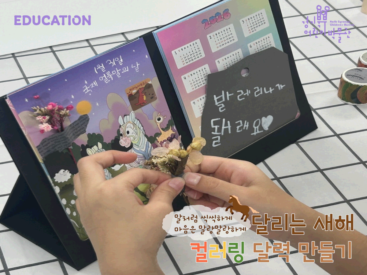 🐎 프로그램 소개|달리는 새해, 컬러링 달력 만들기 🎨 색으로 채우는 새해 한 장.새해를 시작하는 방법은 꼭 거창할 필요가 없잖아요. 이번 프로그램은 아이가 직접 색칠하고 꾸미며 완성하는 컬러링 달력 만들기로, 한 시간 동안 차분하게 집중하며 즐길 수 있는 토요일 체험 활동입니다. 아이가 직접 만들고 꾸미는 나만의 달력.이미 만들어진 달력을 사서 쓰는 것과 달리, 아이가 손으로 한 칸 한 칸 채워서 완성하는 달력은 결과물 자체가 더 특별해요. 좋아하는 색을 고르고, 그림을 채우고, 달력 한 장을 ‘내 작품’으로 만들어가는 과정이 자연스럽게 아이의 표현력을 끌어내 줍니다. 무엇보다 집에 가져가서 실제로 걸어두고 사용할 수 있으니, 만들기에서 끝나는 체험이 아니라 일상에서 계속 이어지는 기억이 됩니다...